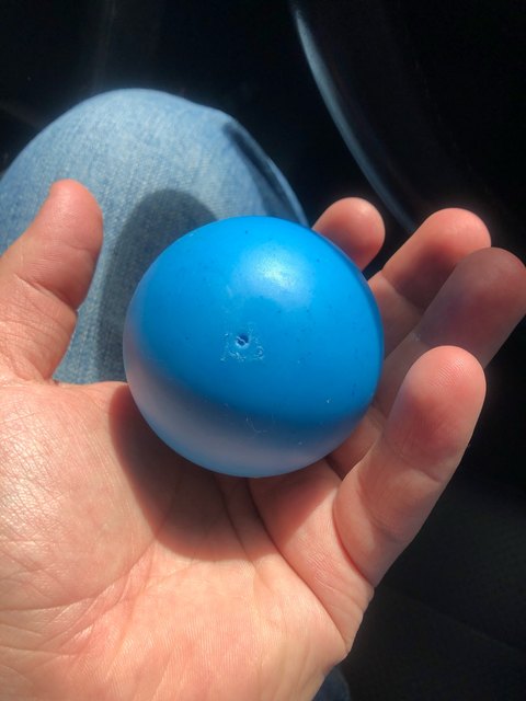 Мяч жёсткий хороший , внутри пластиковый корсет с полостью , сверху резиновый , жёсткий . Имеет внутреннюю полость с крышкой , которая при интенсивных нагрузках может откручиваться . Доставка супер быстрая , с магазином не общалась